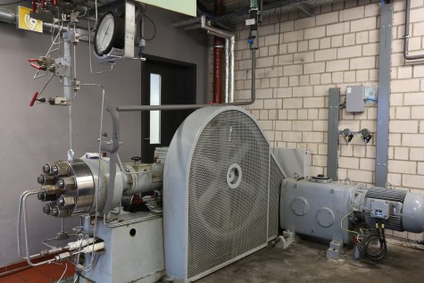 Für Hochdruckexperimente besitzen wir drei Verdichter – zwei Membranverdichter und einen hydraulisch betriebenen Kolbenverdichter. Diese speisen Ethen oder wahlweise andere Gase mit einem Druck von bis zu 3000 bar in unser Versorgungsnetz ein. Außerdem besteht die Möglichkeit Flüssiggase über eine vorgeschaltete Pumpe in einen der beiden Membranverdichter zu leiten.