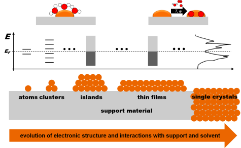 Die elektronischen Eigenschaften von Fe, wie z.B. Bandstruktur, Austrittsarbeit, Ionisationspotential und Elektronenaffinität, die die Redoxeigenschaften von Fe bestimmen, hängen empfindlich von der chemischen Umgebung ab. Mit einem kombinierten labor- und synchrotronbasierten Spektroskopieansatz im Valenz- und Kernniveaubereich unter Zuhilfenahme von komplementären Methoden der Oberflächenphysik soll ein komplettes Bild der Einflüsse der chemischen Umgebung auf die elektronische Struktur von gut definierten, Fe Modellsystemen (Fe Atome, Cluster, dünne Schichten, Einkristalle) erarbeitet werden. Die Wechselwirkung mit Wasser, Sauerstoff und Wasserstoff soll unter Gas- und Flüssigphasenbedingungen untersucht werden und die Abhängigkeiten von Größe und Morphologie der Fe Spezies sowie der Supporteigenschaften und den Redoxeigenschaften sollen in enger Zusammenarbeit mit Theoriegruppen systematisch abgeleitet werden.